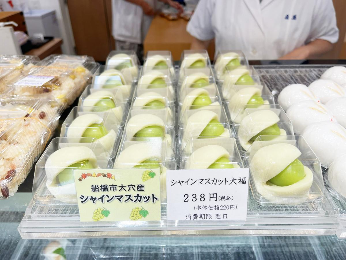 松が丘バス通りにある「御菓子処 扇屋」(船橋市松が丘4)が9月25日から、大穴地区の農家が生産したシャインマスカットを使った「シャインマスカット大福」の販売を期間限定で始めた。