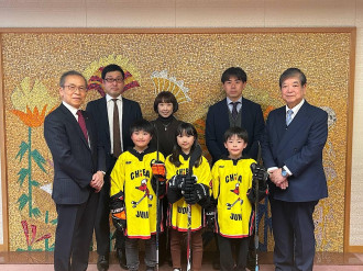 千葉県在住の小学3年生以下で構成する「アイスホッケーU9千葉県選抜チーム」として全国大会に出場する船橋市内の小学校に通う児童3人が、市長に大会への決意を報告するため、3月10日、船橋市役所を訪れた。