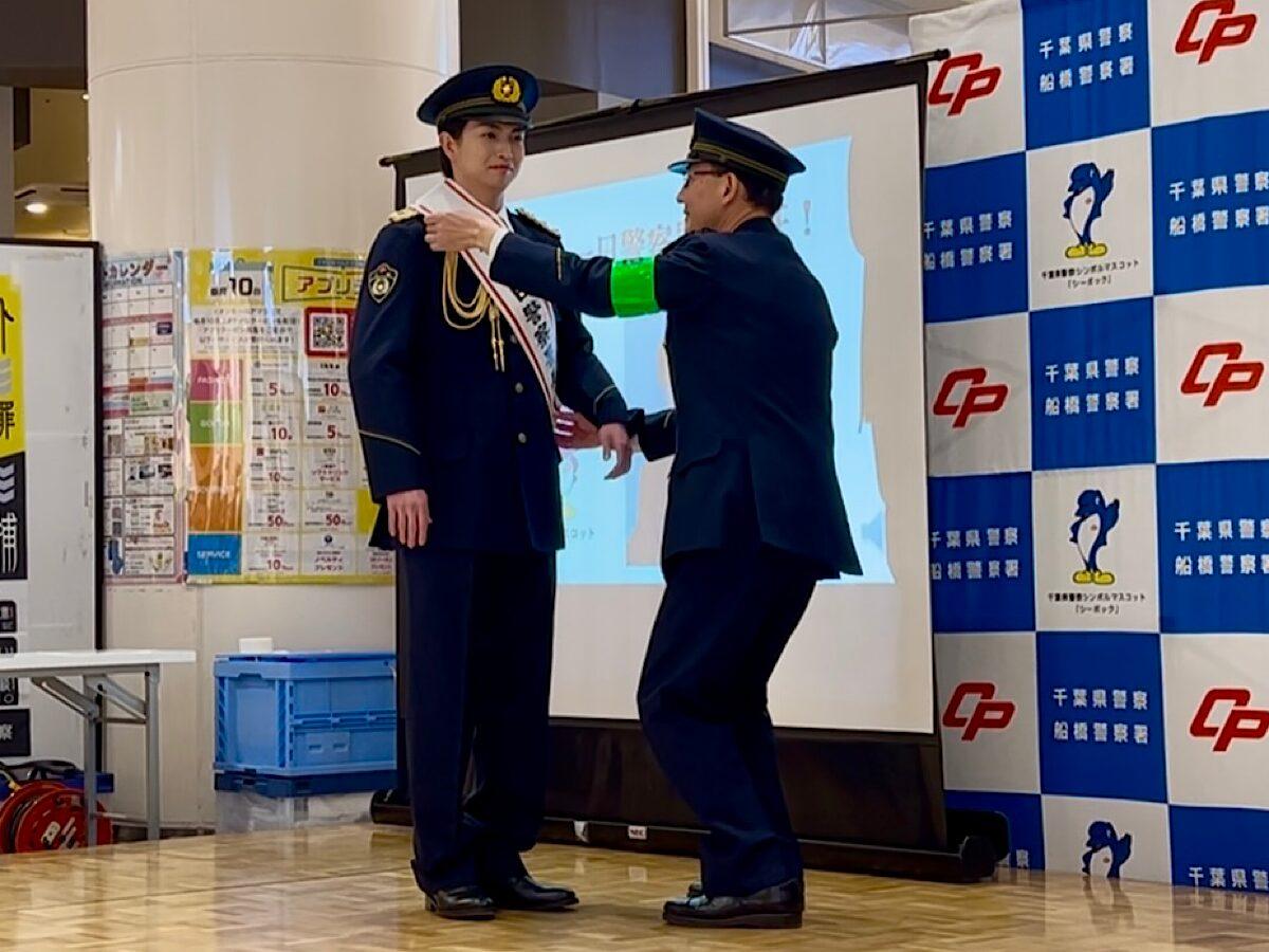船橋警察署が主催する「電話de詐欺被害防止キャンペーン」がイオンモール船橋(船橋市山手1)で4月24日に行われ、一日警察署長を務めた船橋市出身の俳優・綱啓永さんが制服姿で登場した。