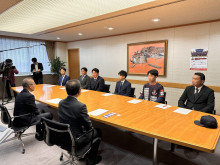 プロ野球独立リーグ「ルートインBCリーグ」に本加盟が決まった「千葉スカイセイラーズ(千葉県民球団)」(船橋市松が丘3)が10月21日、船橋市役所を訪れ、松戸徹市長に加盟報告を行った。