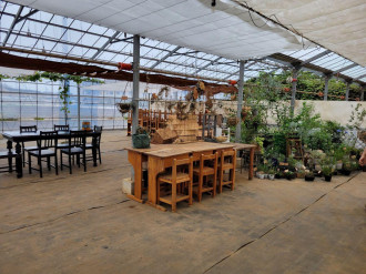 ハウス内にも随所にグリーンが置かれ、一角ではブドウ棚も育てている。約70坪の広々としたハウス内にはアンティーク調のメインテーブルのほか、机と椅子20セットを用意。木箱やかご、家具なども自由に利用できる。利用スタイルは1日利用(8時30分~18時、1万2,000円~)と時間貸し(1時間2,000円~、18時~21時は1時間2,500円~)の2種類。