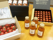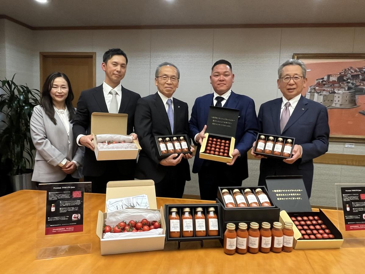 船橋市内のトマト農家「Dファーム」(船橋市馬込町)とJAいちかわの関係者らが3月12日、船橋市役所に松戸徹市長を訪問し、船橋産ミディトマトを100%使ったプレミアムトマトジュース「Premium トマトジュース」の発売を報告した。