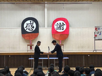 船橋市内に事業所(船橋市西浦3)を構えるエーエスペイント(本社=愛知県豊明市)が法典小学校(藤原5)に子ども用卓球台を贈る「寄贈式」が1月26日、同校5年生児童らが出席して行われた。