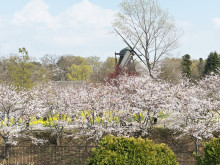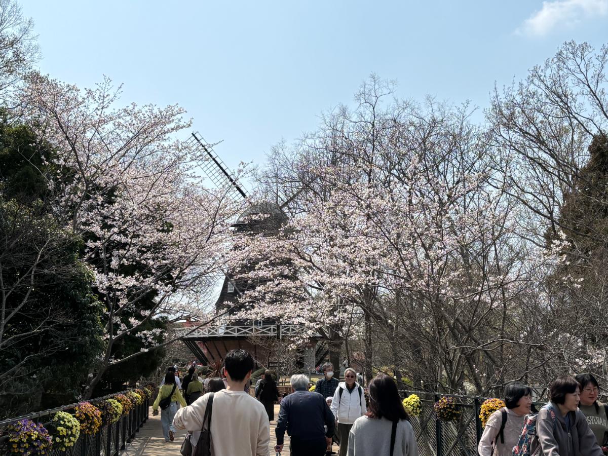 風車を背景にして広がる桜並木