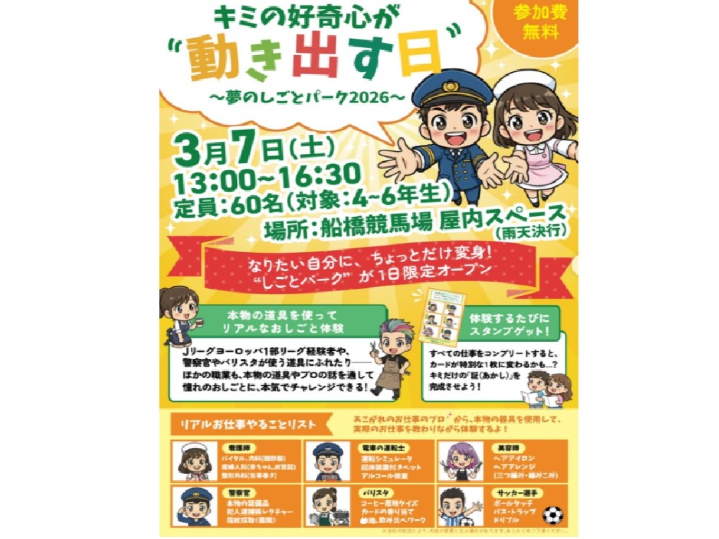 船橋競馬場(船橋市若松1)のVIPルームで3月7日、小学4~6年生を対象とした職業体験イベント「キミの好奇心が動き出す日~夢のしごとパーク2026~」が開催される。