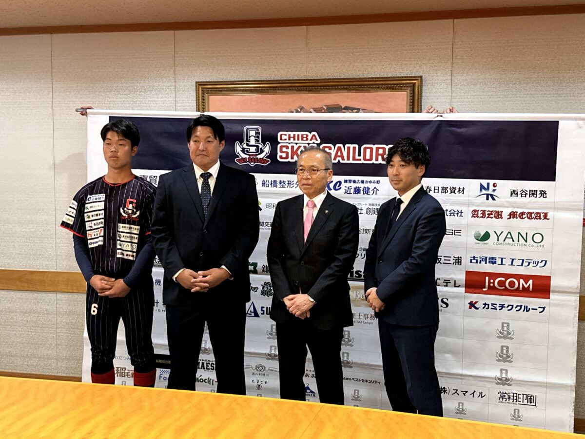 プロ野球独立リーグ「ルートインBCリーグ」に本加盟が決まった「千葉スカイセイラーズ(千葉県民球団)」(船橋市松が丘3)が10月21日、船橋市役所を訪れ、松戸徹市長に加盟報告を行った。