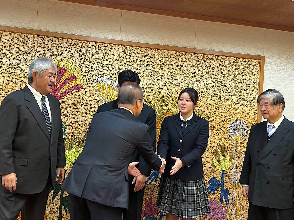 飯山満南小学校出身の兄・佐藤秀一郎さんと妹・優さんが11月18日、9月に行われたビーチレスリングの世界大会に出場したことを松戸徹市長と松本淳教育長に報告するため、千葉県レスリング協会に所属する父・秀男さんと船橋市役所を訪れた。
