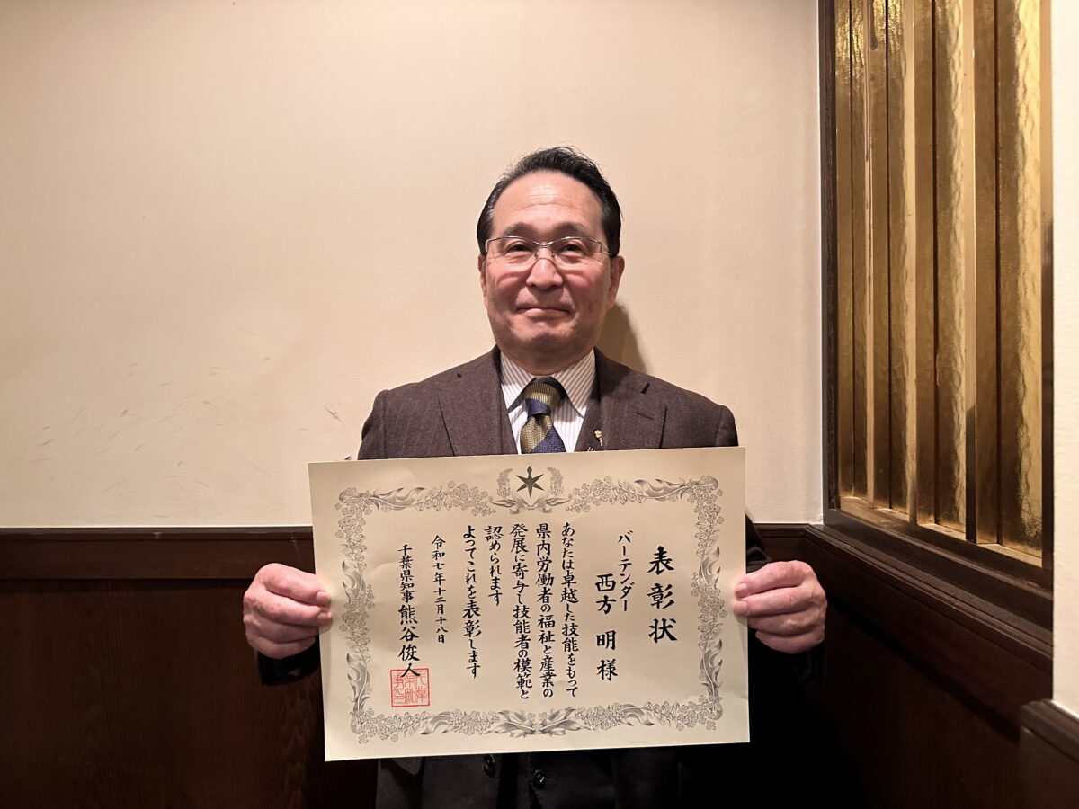 船橋市内のバー文化における草分けともいえる「BLUE CANARY(ブルーカナリー)」(船橋市本町4)店主の西方明さんが12月18日、千葉市で行われた「千葉県職業能力開発促進大会」の中で行われた授賞式で「千葉県の卓越した技能者」として表彰された。