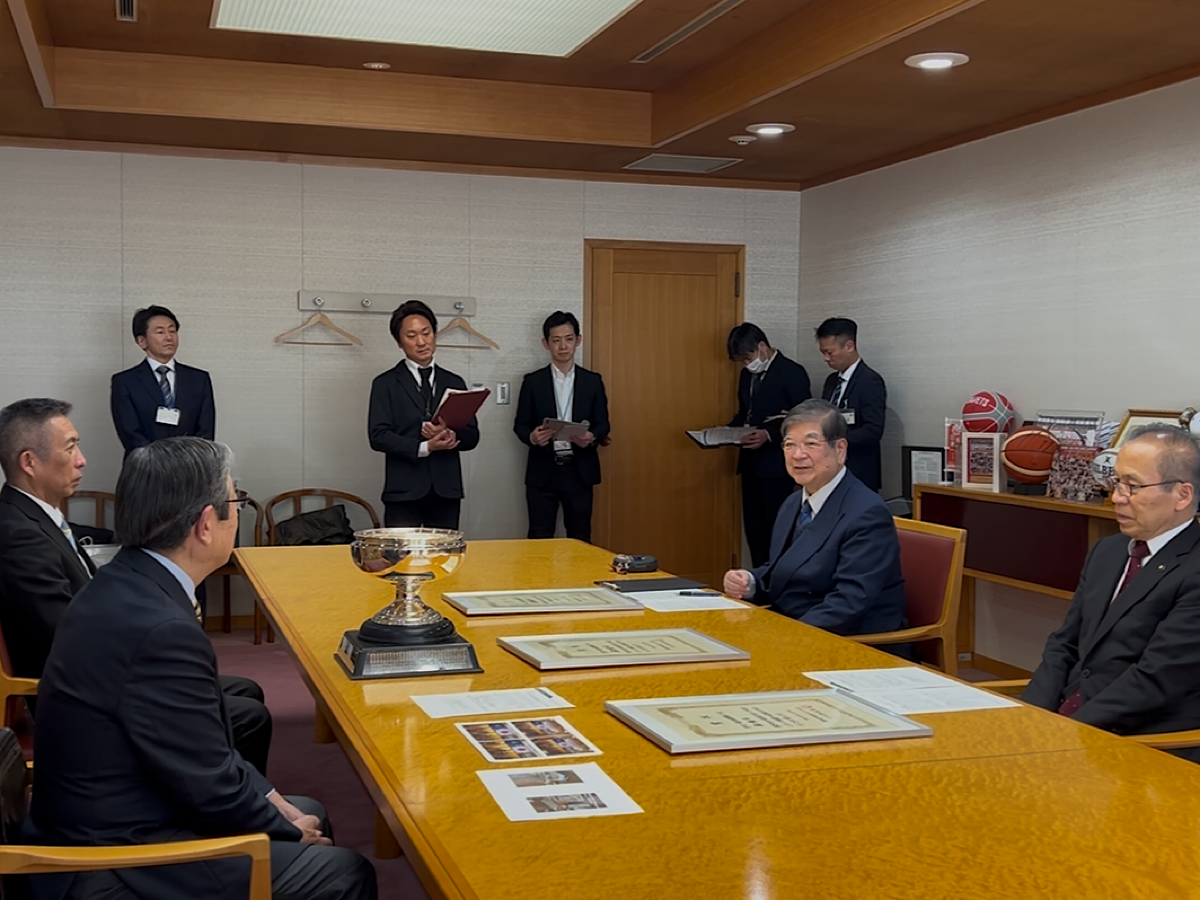 「第75回千葉県民スポーツ大会」で船橋市選手団が男女総合成績で優勝したことを報告するため、2月12日、選手団を代表して船橋市選手団長の船橋市スポーツ協会・山崎幸男会長と同選手団総監督の中野誠理事長が船橋市役所を訪れた。