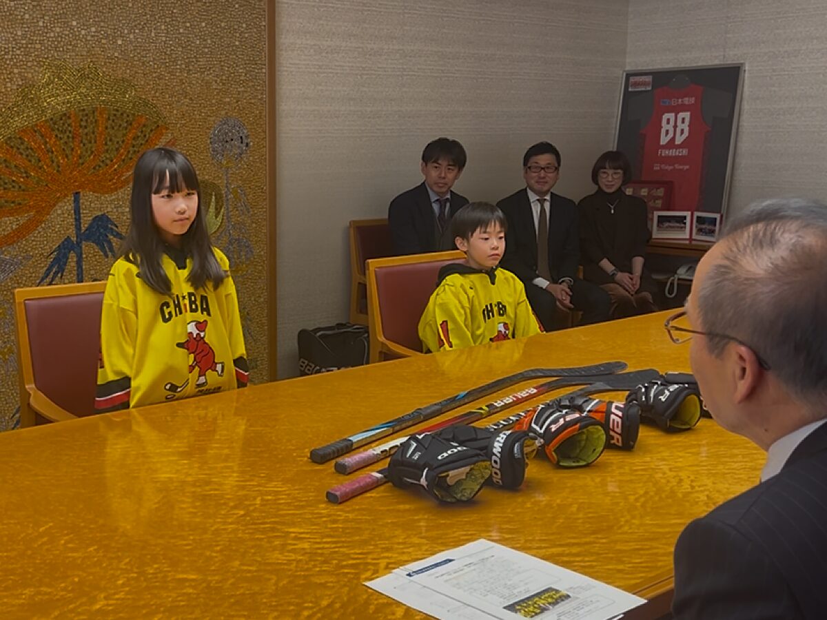 千葉県在住の小学3年生以下で構成する「アイスホッケーU9千葉県選抜チーム」として全国大会に出場する船橋市内の小学校に通う児童3人が、市長に大会への決意を報告するため、3月10日、船橋市役所を訪れた。