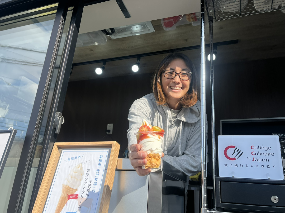 船橋市内のトマトとイチゴを主力にする農家「三須トマト農園」(船橋市印内3)が2月16日、京成西船駅前の空き地でソフトクリームなどを販売するキッチンカーの営業を始めた。