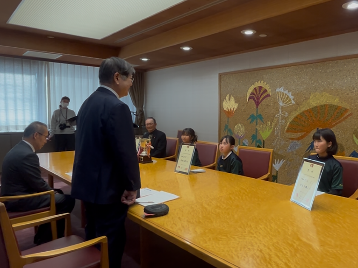 全国小学生ソフトテニス大会に出場する「船橋ジュニアソフトテニスクラブ」の小学生3選手が3月11日、船橋市役所を訪れた。