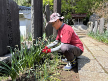 参道の花樹などを手入れする菊地さん
