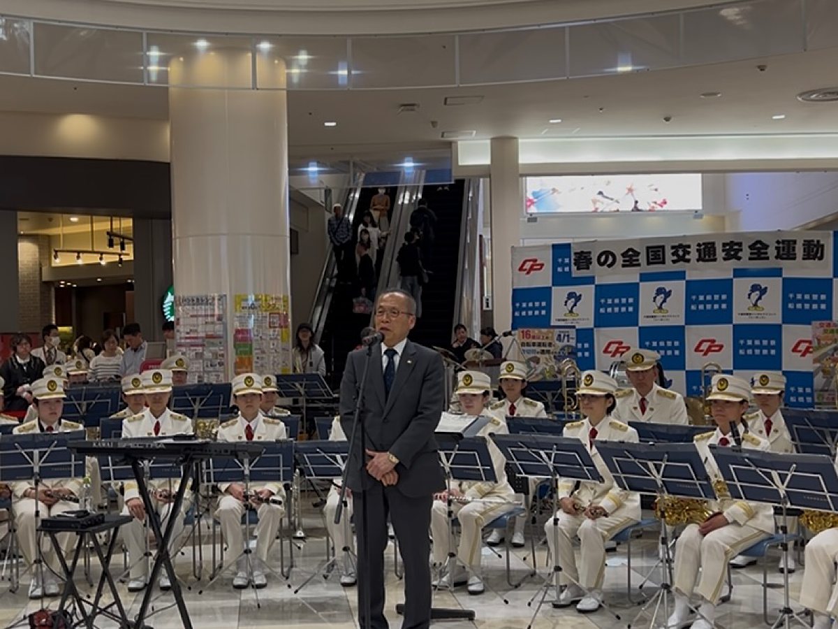 「楽しみながら家族で交通安全について話してほしい」とあいさつする松戸徹市長