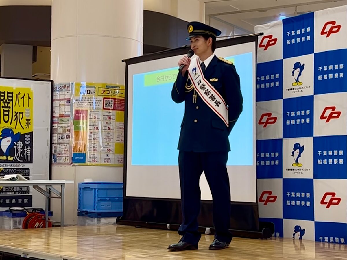 船橋警察署が主催する「電話de詐欺被害防止キャンペーン」がイオンモール船橋(船橋市山手1)で4月24日に行われ、一日警察署長を務めた船橋市出身の俳優・綱啓永さんが制服姿で登場した。