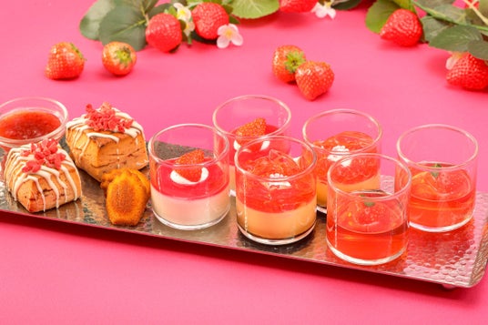 「いちごパンナコッタ」など、見た目も華やかなグラススイーツをご用意しました。さらに、いちごが練り込まれたホテルメイドの