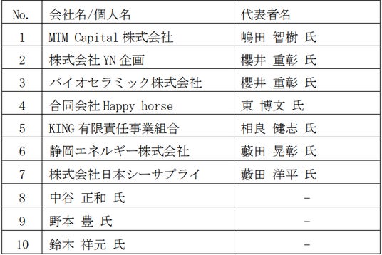 本勧告書において、当社独立委員会は、MTM Capital株式会社、株式会社YN企画、バイオセラミック株式会社、合同会社Happy horse、KING有限責任事業組合、静岡エネルギー株式会社、株式会社日本シーサプライ、中谷正和氏、野本豊氏及び鈴木祥元氏(以下「本認定対象株主」といいます。)の間において、当社株式に関して共同協調行為に該当する行為を行っていると認められる旨勧告しております。