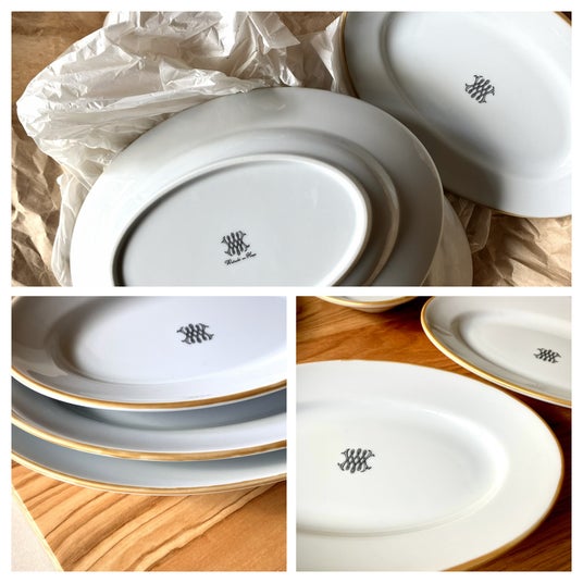 縁にマットゴールドを施し上品に仕上げ、積み重ねた側面の美しさにこだわりました。一番小さなSサイズのプレートの中央には「W」マークを、全3サイズのプレートの裏面にはロゴ入りの「W」マークが施されています。