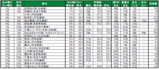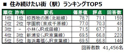 1位は5年連続で、印西市に位置する印西牧の原です。2位は、2年連続で千葉市緑区に位置する学園前です。3位は初登場の印西市に位置する小林で、昨年は累計回答数が30名未満でランキング集計対象外だった駅です。トップ10内では、7位の京成稲毛が昨年20位から大きく順位を上げてトップ10入りしています。