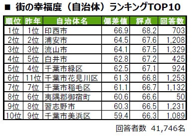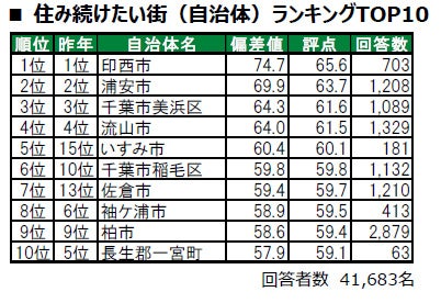 1位は5年連続で印西市で、唯一偏差値70台の高い評価を得ています。2位は、3年連続で浦安市です。トップ2は、「住みここち」「街の幸福度」「街に誇りがある」でもトップ2となっている自治体です。3位は、3年連続で千葉市美浜区です。トップ10内では、5位のいすみ市(昨年15位)、7位の佐倉市(昨年13位)が昨年から順位を上げてトップ10入りしています。
