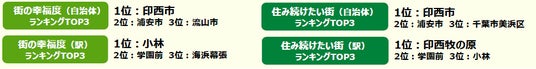 ※「街の幸福度(駅)・住み続けたい街(駅)」は、駅徒歩15分以内に居住している回答者が30名以上の駅を、「街の幸福度(自治体)・住み続けたい街(自治体)」は、回答者50名以上の自治体を対象として集計しています。