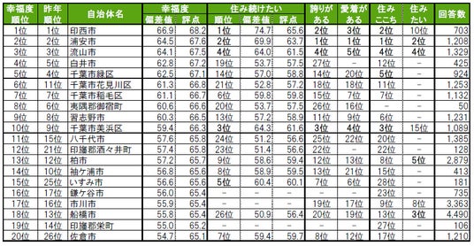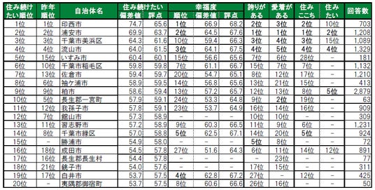 ●トップ20内では、12位印旛郡酒々井町(昨年21位)、15位いすみ市(昨年25位)、20位佐倉市(昨年26位)が、昨年より順位を上げてトップ20入りしています。