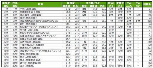 ●トップ20内では、14位ユーカリが丘(昨年24位)、16位豊四季(昨年31位)、17位千葉寺(昨年28位)、19位高根木戸(昨年22位)、20位千葉みなと(昨年25位)が、昨年より順位を上げてトップ20入りしています。