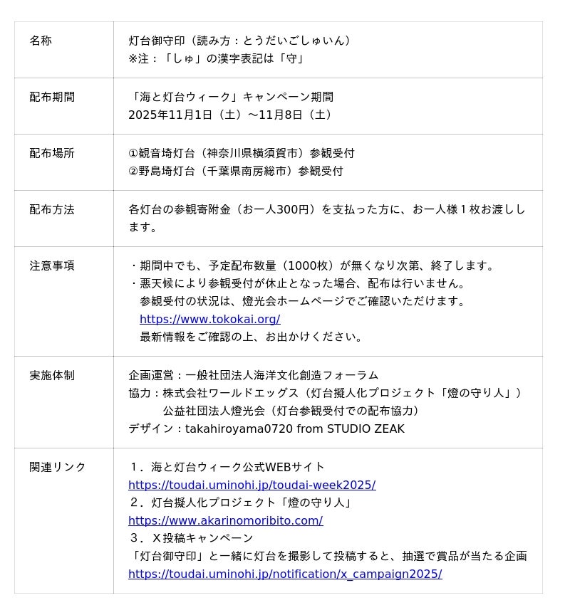 日本財団「海と灯台プロジェクト」を運営する一般社団法人海洋文化創造フォーラムは、この度、プロジェクトとして初となる「灯台御守印(とうだいごしゅいん)」を作成。2025年11月1日~8日の「海と灯台ウィーク」期間中、日本第1号の西洋式灯台である観音埼灯台(神奈川県)と同第2号の野島埼灯台(千葉県)にて、参観された方にお渡しします。
