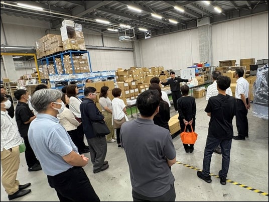当日は「物流倉庫とは」という基礎知識を中心に、入庫から出庫までのプロセスを解説。さらに、化粧品など許可を要する商品の流通加工や、ラウンジをはじめとした施設環境も紹介されました。多くの参加者にとって、大規模物流倉庫の訪問は初めてであり、物流が製品の品質保証や安定供給を支える基盤であることを実感する機会となりました。