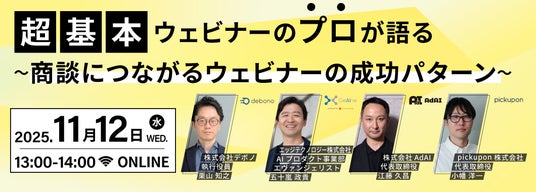 pickupon株式会社(千葉県市川市、代表:小幡洋一、以下pickupon)の代表・小幡は、11月12日(水)開催の4社によるウェビナー「【超基本】ウェビナーのプロが語る ~商談につながるウェビナーの成功パターン~」に登壇いたします。オンラインでの営業活動が主流となる中で、ウェビナーを開催しても見込み客の獲得につながりにくいという、多くの企業が抱える課題に対する必要な視点や具体的な成功事例をお話しします。