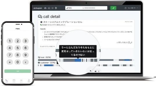 会話サマリーAI電話「pickupon(ピクポン)」は、AIが電話で話した内容のサマリーをテキスト×音声で作成し、自動入力・共有してくれるサービスです。入力を意識せず、顧客との会話内容をチームのワークスペース(CRM・SFAなど)へシェアします。これにより、営業の架電シーンにおける入力漏れを防ぎ、入力コストを削減し、営業活動のブラックボックス化問題を解決します。