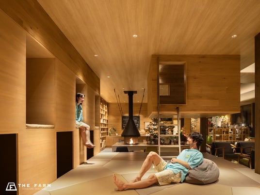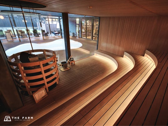 THE FARM敷地内の温浴施設「おふろcafe かりんの湯」には、地下1,500mから汲み上げたあたたかい塩化物強塩泉の天然温泉や、屋外型のサウナエリア(セルフロウリュ式・水風呂など)と食事スペースがそろっており、