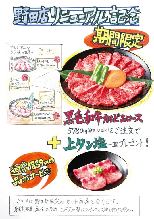 野田店リニューアル記念。1月12日(祝)までの期間限定で、大皿の「黒毛和牛カルビ&ロース【300g】」5780円(税込6358円)をご注文のお客様に「上タン塩」1690円(税込1859円)を一皿プレゼントいたします!年末年始や成人式などの大切な集まりにピッタリな豪華な大皿の黒毛和牛の盛り合わせ。とろける黒毛和牛を当店自慢の炭火で炙れば、豊かな香りで笑顔になること間違いなしです!さらに上タン塩もプレゼントなんて楽しさも笑顔も二倍!!ぜひ皆様お誘い合わせの上、ご利用いただければ幸いです。