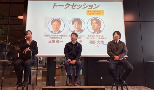 河野大助氏(ドローンジャーナル編集長)をモデレーターに、両社長によるトークセッションを実施しました。