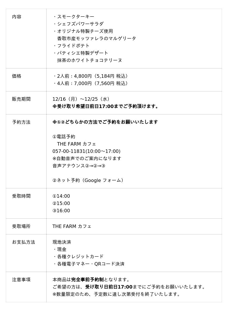 近年増加する“おうちクリスマス”需要や物価高騰を背景に、節約しながらも特別なひとときを楽しみたい、という消費者ニーズに応える商品として、THE FARMカフェのシェフこだわりの味を詰め込んだクリスマス限定商品をご用意しました。