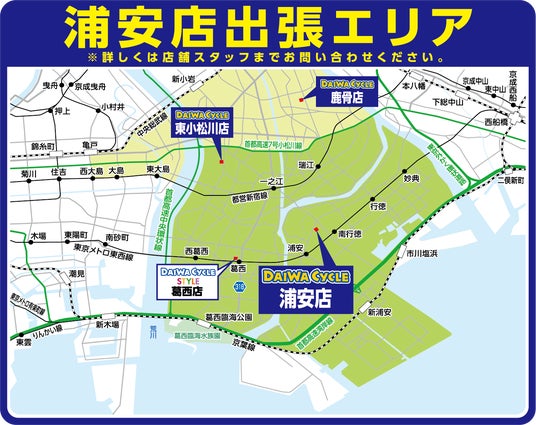 ※薄い緑色の範囲は、ダイワサイクルの他店舗からの出張エリアとなっておりますのでご注意ください。
