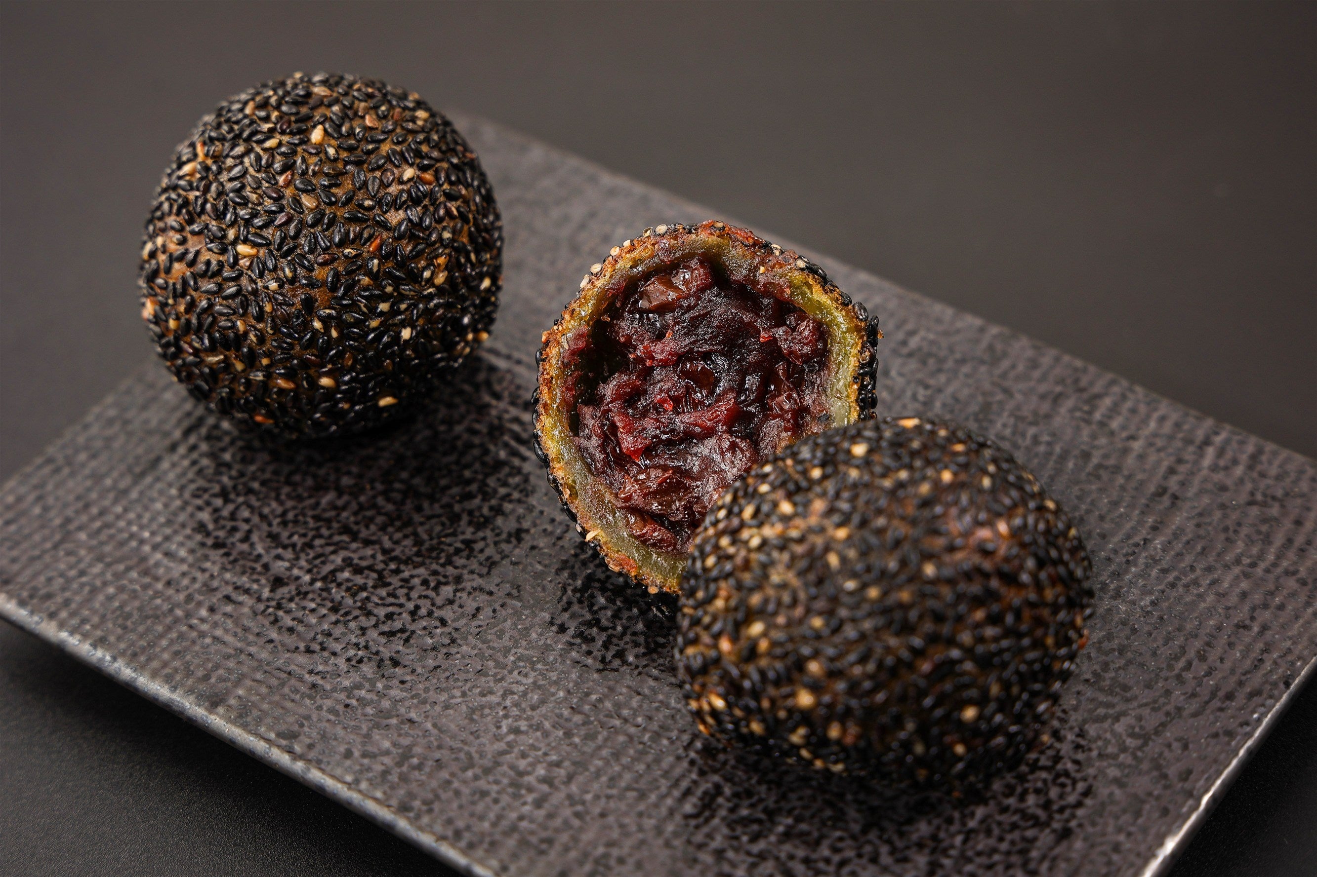 ラム酒と紹興酒が芳醇に香る自家製レーズン餡を、よもぎを練り込んだ皮で包み、漆黒の胡麻を纏わせました。黒胡麻の香ばしさと洋酒の余韻が重なる、少し大人な味わいに仕上げた逸品。