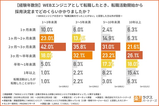 また、WEBエンジニアの転職実態を見ると、経験年数が少ない層ほど短期間で転職が決まりやすい一方、経験年数が増えるにつれて転職活動が長期化する傾向が見られました。