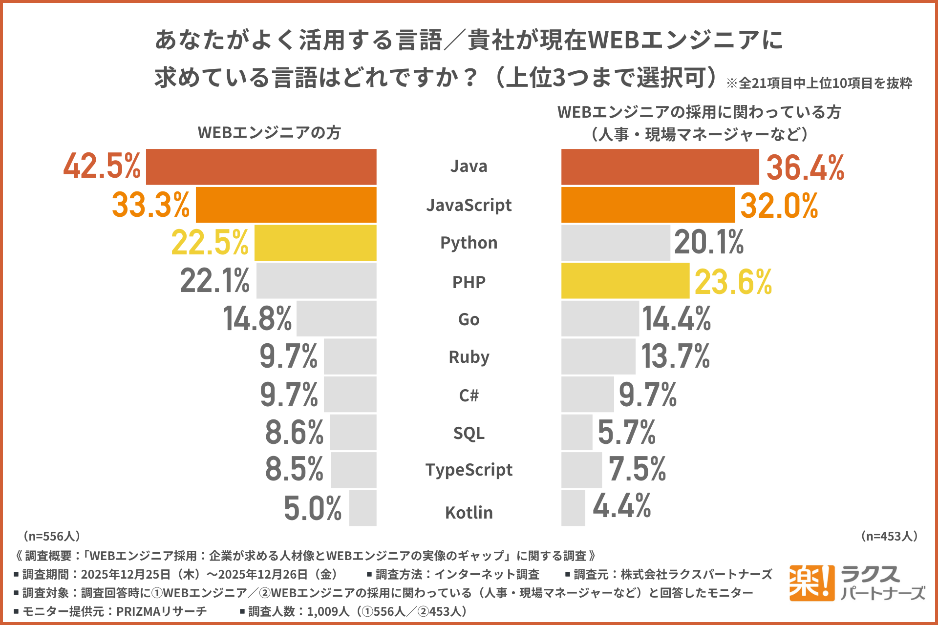 『Java』『JavaScript』が双方で1位・2位を占めており、その他の言語もギャップが見られないことから、WEBエンジニアの保有スキルと企業のニーズがおおむね一致していることがうかがえます。