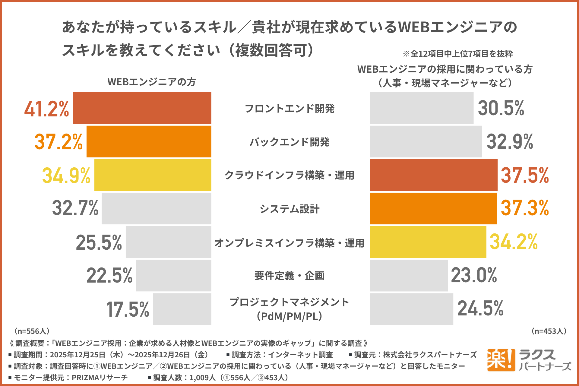 ITエンジニアの派遣・SES事業を展開する株式会社ラクスパートナーズ(東京都新宿区、代表取締役:吉田 雅行)は、1.WEBエンジニア/2.WEBエンジニアの採用に関わっている方(人事・現場マネージャーなど)を対象に「WEBエンジニア採用:企業が求める人材像とWEBエンジニアの実像のギャップ」に関する調査を実施しました。本リリースでは一部を抜粋しお知らせいたします。