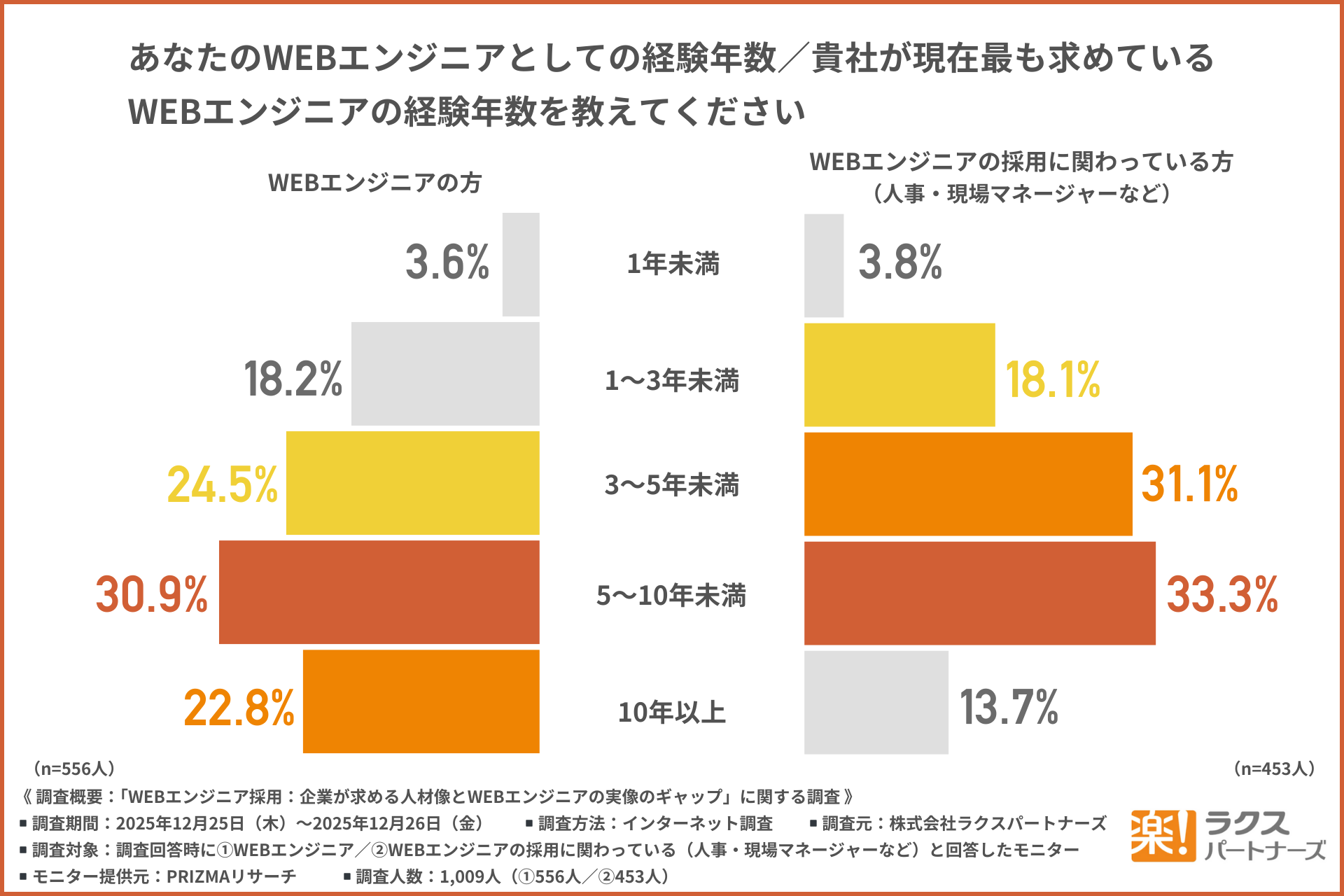 経験年数を比較してみると、どちらもボリュームゾーンは中堅層である「3~10年未満」に集中していますが、WEBエンジニア側では「10年以上」のベテラン層も一定数存在しているのに対し、企業側のニーズは実務を任せやすい中堅層に偏っていることが見て取れます。