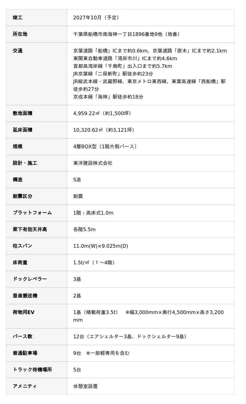 東京建物株式会社と三井物産都市開発株式会社は、千葉県船橋市においてマルチテナント型冷凍・冷蔵物流施設「T-LOGI船橋南海神」(以下「本物件」)が2026年2月2日に着工したことをお知らせします。本物件の竣工は2027年10月を予定しています。