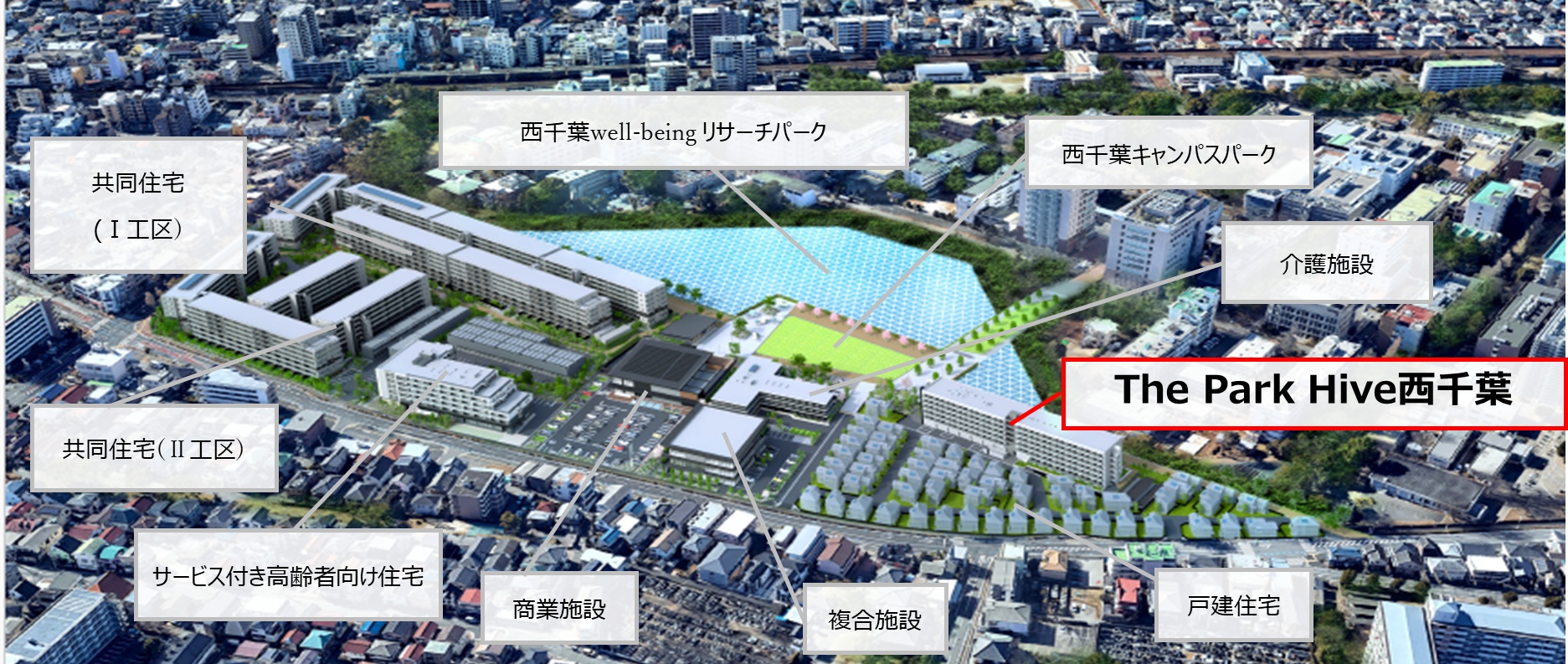 東京大学西千葉キャンパス跡地はJR総武線「西千葉」駅から徒歩3分に位置し、周辺には千葉大学をはじめとする教育機関が集積する約75,000平方メートル の文教エリアです。その中で、大規模複合開発「千葉 学美の杜」は、併せて約 1,300 戸の共同住宅・学生マンション・サービス付き高齢者向け住宅を建築するほか、戸建住宅、商業施設、複合施設、介護施設などの整備が予定されています。敷地内には歩行者動線や約12,000平方メートル の広場空間「(仮称)西千葉キャンパスパーク」が設けられ、駅・大学・周辺住宅地との回遊性の高い街区構造を形成する計画です。
