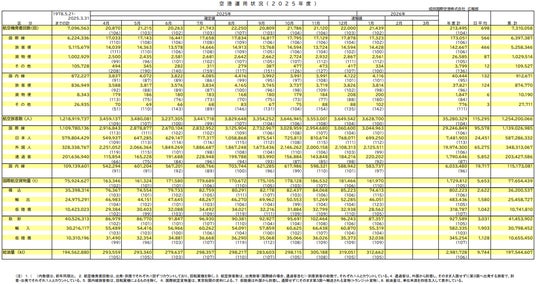 ● 国際線旅客便発着回数(※1)は中国路線が1,924回(前年同月比70%)と減少したものの、その他のアジア方面等の路線が好調に推移したことから14,428回(前年同月比100%)となりました。