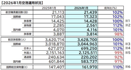 ● 国際線旅客数(※3)は継続的な訪日需要の高まり等により、304万人(前年同月比101%)となりました。