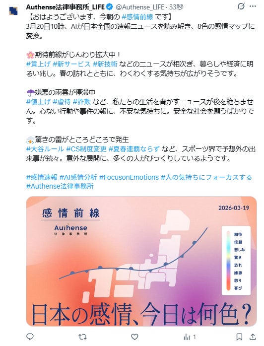 毎朝、天気と一緒に「社会感情」もチェックする時代へ"今日の社会感情"をAIで可視化する取り組みをXで配信開始|Authense法律事務所