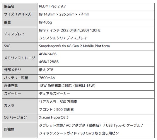 ■REDMI Pad 2 9.7 スペック概要