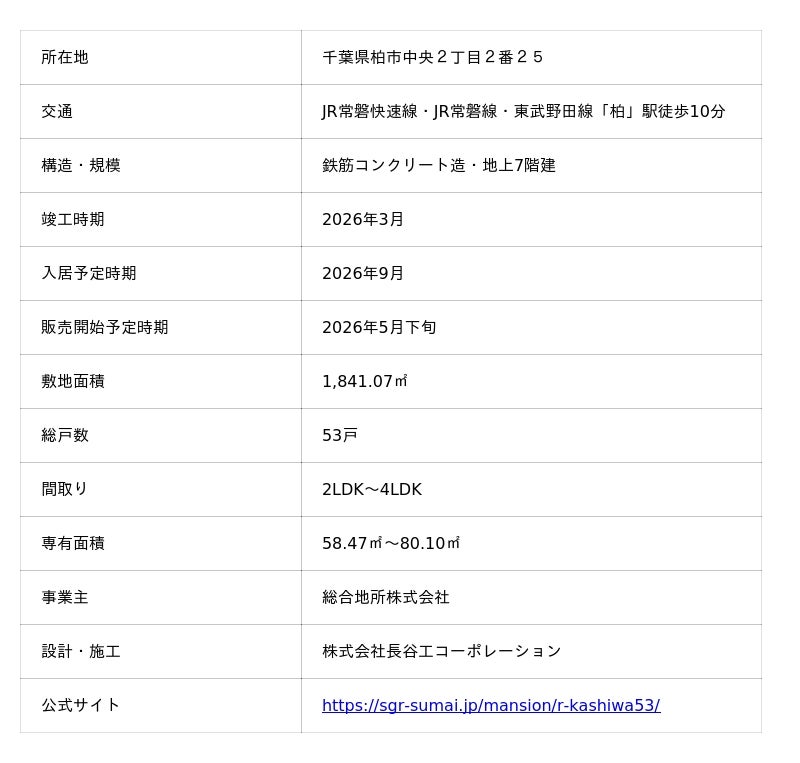 総合地所株式会社(本社:東京都港区、代表取締役社長:梅津 英司)は、新築分譲マンション「ルネ柏ザ・レジデンス(以下、「本物件」)」の現地販売センターを5月2日(土)よりグランドオープンすることをお知らせいたします。